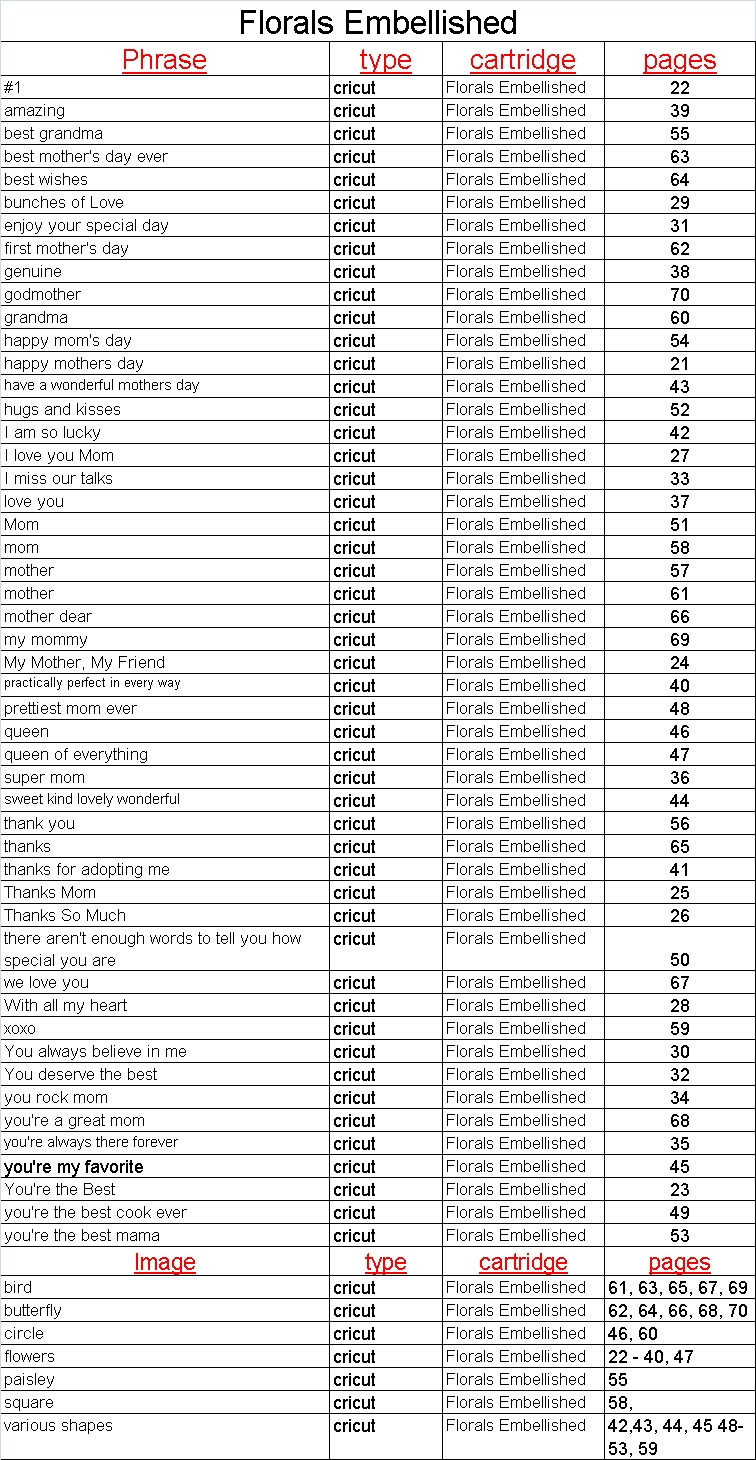 Here is a link to the Florals Embellished handbook PDF. Below you will find a "table of contents" for Florals Embellished. It has every image and phrase you will find on the cartridge along with its corresponding page number. If you find any errors in the spreadsheet, please let me know so I can make corrections. If you would like to share this information on your blog, instead of copy and pasting this info, please paste a link to my site. The spreadsheet below is a JPEG but you can download a PDF version by clicking here: